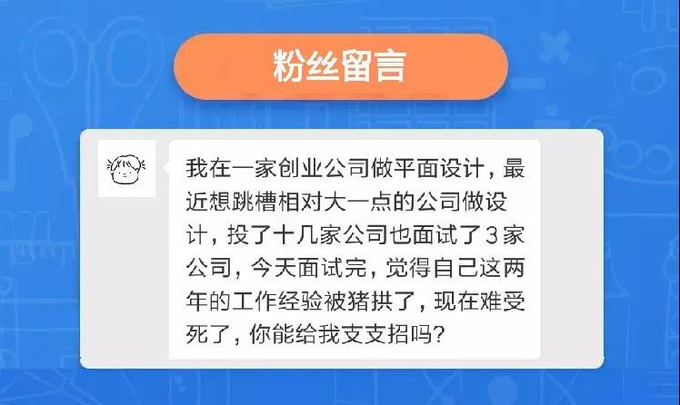 其实,小编在后台经常能收到类似的留言,其实很多是想要进入设计行业的应届生,或者刚工作一两年的初级设计师(平面,电商美工,初级UI),他们有很多想要进入行业或者是跳槽,但是因为学历,背景,项目经验等种种原因,还没找到心仪的设计相关的工作。