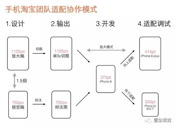 第一步,视觉设计阶段,设计师按宽度750px(iPhone 6)做设计稿,除图片外所有设计元素用矢量路径来做。设计定稿后在750px的设计稿上做标注,输出标注图。同时等比放大1.5倍生成宽度1125px的设计稿,在1125px的稿子里切图。