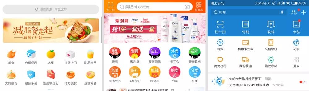 图形:图标的下方是和子版块相关的图形,不过因为淘宝的业务线众多,风格也不一,所以没有将下方的业务图形做成完全统一的风格。但在设计风格上都是扁平化的图标,没有添加阴影高光等立体效果。