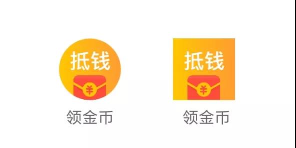 纵观多种案例,我们会发现一个问题,为什么电商类APP 金刚区图标多为圆形呢?我们来一起思考一下。从圆和方的直观感受来讲,圆给人一种亲近柔和的感觉,而正方形有4个棱角会让人感觉很生硬显得有距离感。在设计上来讲,方形的图标还需要考虑到四个棱角部分的设计不然会显得很空,圆形会显得更加聚焦内容,如下图。而且如果一排5个宽和高相同的圆形和方形图标,方形图标面积大所以会显得拥挤一些,所以金刚区图标圆形居多一些。