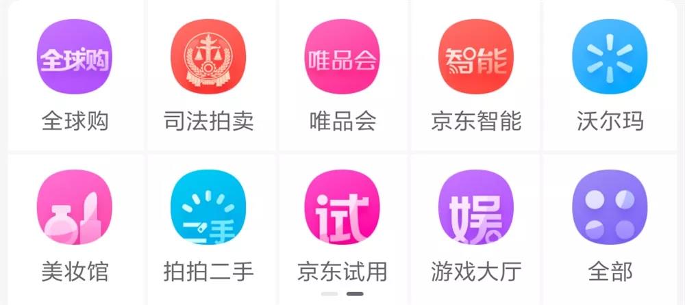 京东APP金刚区组成:超椭圆底板+业务字设计/图形+板块名称