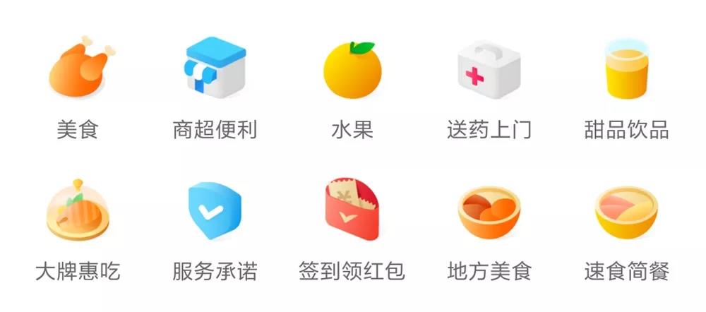 饿了么APP金刚区组成:轴测图立体图标+板块名称