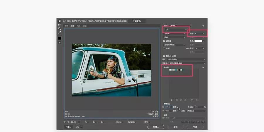 Photoshop打开图片 → 存储为Web所用格式→ 选择GIF格式 → 颜色选择 8 → 颜色表中双击色块 → 拾色器