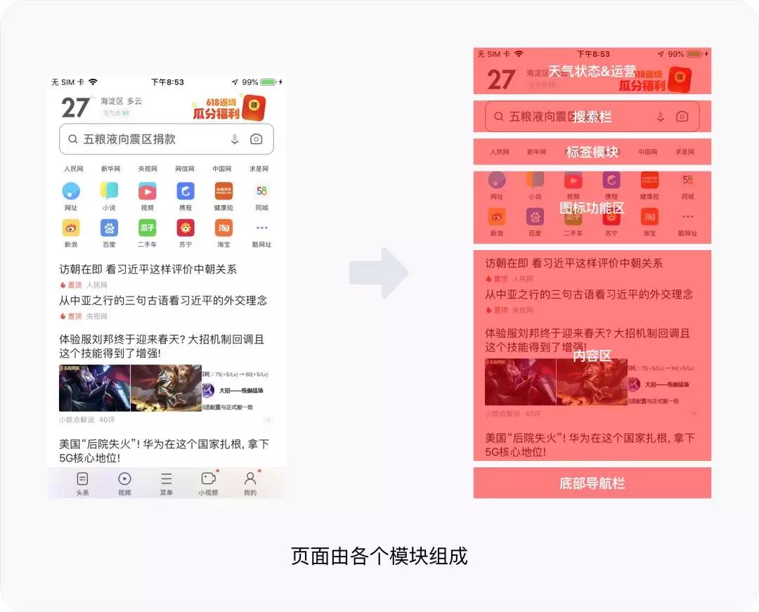 页面是由若干个模块组成,同理也可以我们可以将一个页面拆解成若干的模块。我们在做界面设计的时候也是在做一个由若干个模块的集合体,回想在做设计时候相信大家都是按照模块推动设计工作的。例如UC浏览器,我们通过将页面拆分,可以看到页面是由顶部状态栏、搜索栏、标签栏、图标功能区、内容区、底部导航栏等若干个模块组成。