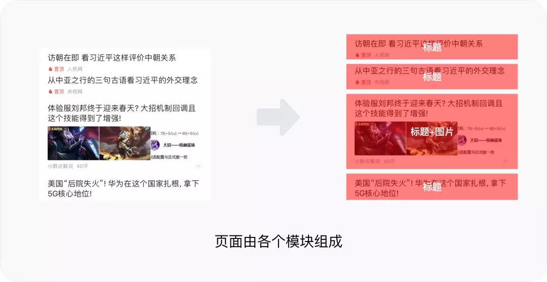 为了能够更好的理解页面的构成,我可以将模块进一步进行拆分各个小模块,例如 UC 浏览器中的内容区域也可以拆分成各个小的内容信息模块,模块内我们还可以把把它们分成“单一标题信息”和“标题信息+图片”两种样式。