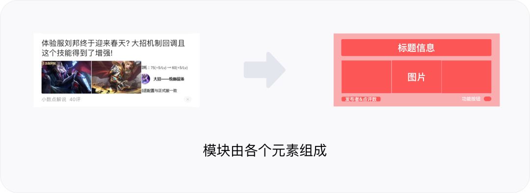 我们再以其中的信息模块为例进一步拆分,一个信息模块是由“标题信息+图片+注释信息”三个元素组成。