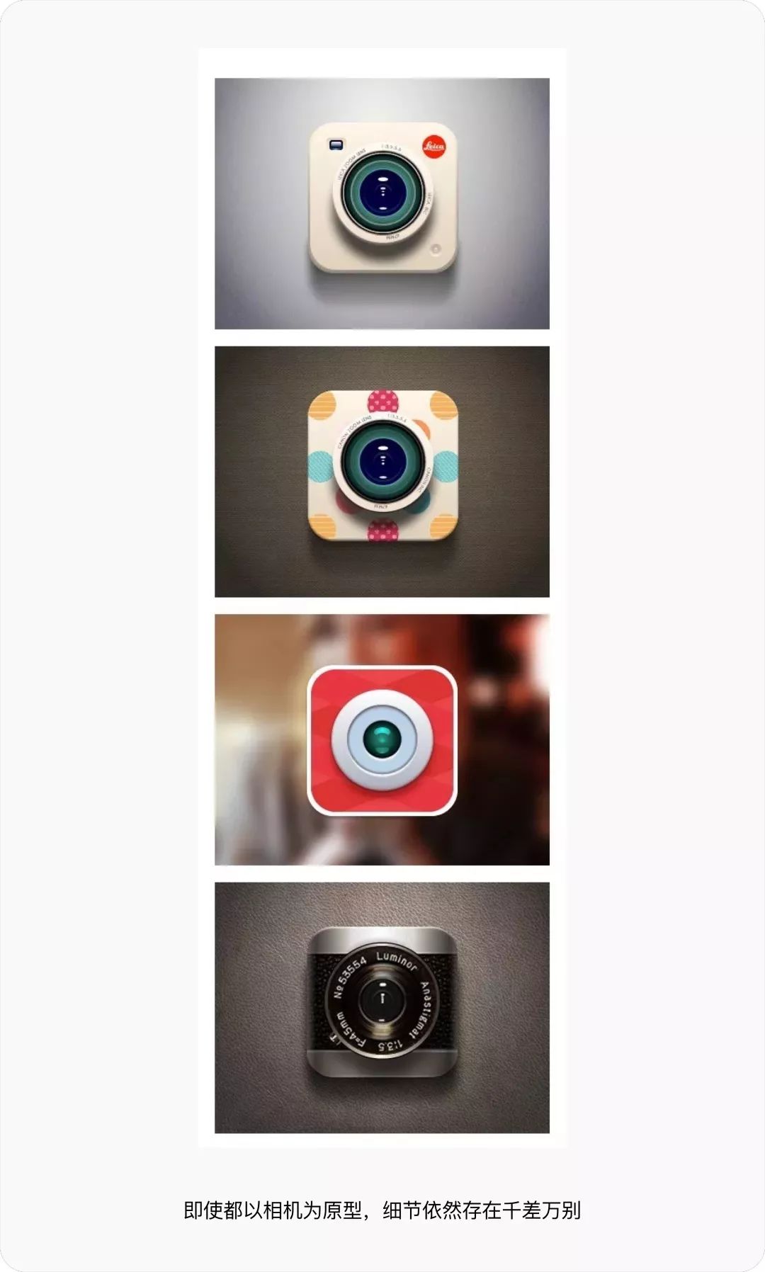 为了避免禁锢我们的思维,所以在找参考我们要扩大自己的搜集范围,并非只找特定的界面参考,即使在做详情页我们同样可以参考其他类型的页面。例如之前兴盛的拟物化设计也是借鉴于生活中的各种场景和物件,例如摄影 APP 频繁使用相机作为桌面图标使用,即使大家都使用相机作为桌面图标,但是细节依然存在千差万别。