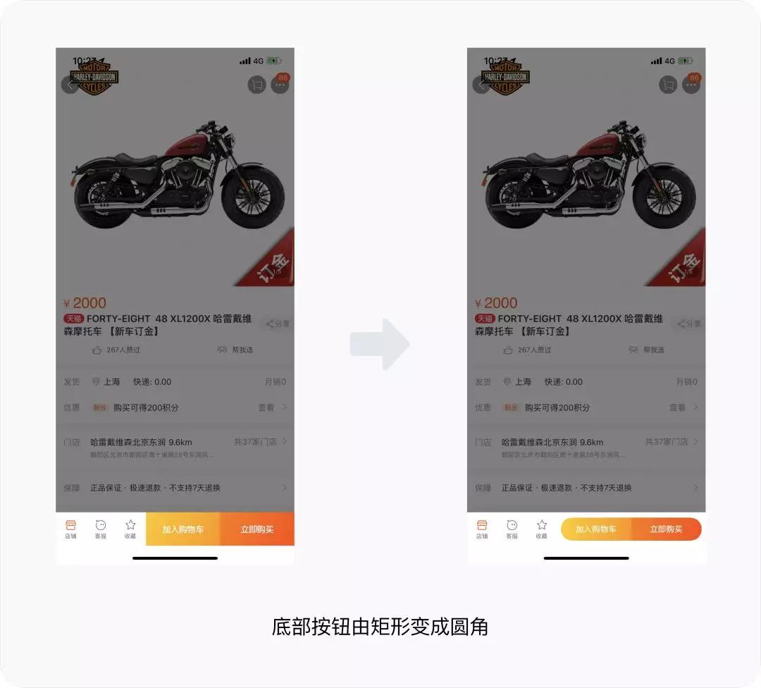 反观现在的 APP 都是高频的微创新,除了大版本的迭代,日常的迭代更新都只进行局部功能的更新,几乎不会出现翻天覆地的改变。例如淘宝的卡片设计的应用也并非是一下子全部完成设计更新,而是一点点去“试水”,逐步去在每个小的应用模块去做更新。例如淘宝详情页中底部的加入购物车和立即购买的按钮样式由原来的矩形边框到圆角按钮的应用,只是细节的改动,并不影响用户的操作习惯。
