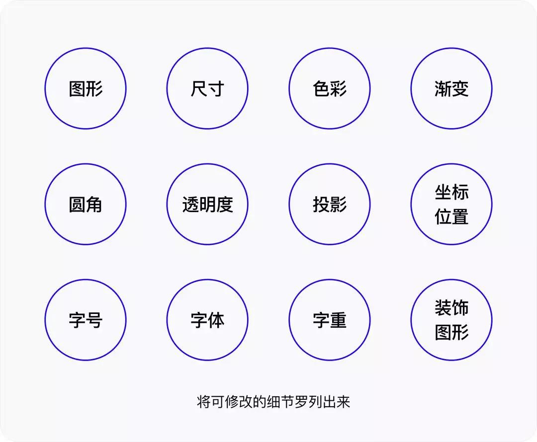 在做细节的修改的时候,可能许多同学一开始没有明确的思路,这是正常的。面对这种情况最简单的方式就是“列清单”。我们可以先将可改动的细节点进行一一罗列,面对具体的细节,将问题具象化,逐步寻求解决方案。以下是我罗列的一些细节点,大家可作参考。例如图形、色彩、尺寸、圆角弧度、渐变、透明度、线的粗细、投影、位置、字体、字号、字重、装饰图形……