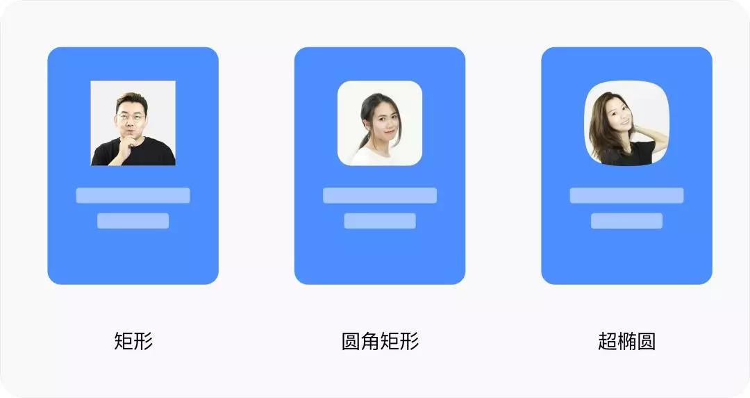 这里我们以卡片的头像设计为例进行图形细节的调整,三种卡片的形式都是相同的,我们通过对头像框图形细节上进行添加圆角、改变线的弧度等细节进行改变会发现,三者之间在不改变的布局的同时有着明显的风格变化。