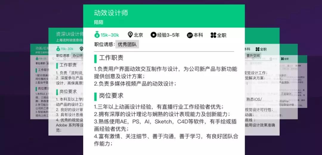 近两年大家有没有发现越来越多的国内公司开始关注动效设计了,越来越多的团队意识到动效在产品用户体验中的重要性。但是为什么需要动效设计?需要什么样的动效?因为随着设计潮流的不断变化,现如今设计的界限已经变得越来越模糊,在视觉设计的表现形式中,比如广告营销、品牌设计以及火爆的UI设计和影视设计后期都融入了越来越多的动效表现形式,就目前各大招聘平台来看,很多UI设计都需要有动效等必备技能,这也成了好多设计师的一个分水岭!