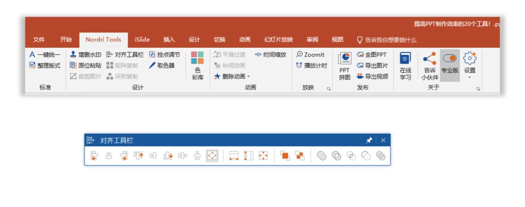 对于Nordri Tools这个插件非常的实用,其中【对齐工具栏】非常的方便,有了它做对齐时,就不用再去PPT中找对齐工具,同时还有【合并形状】里面的几个工具,如图所示。