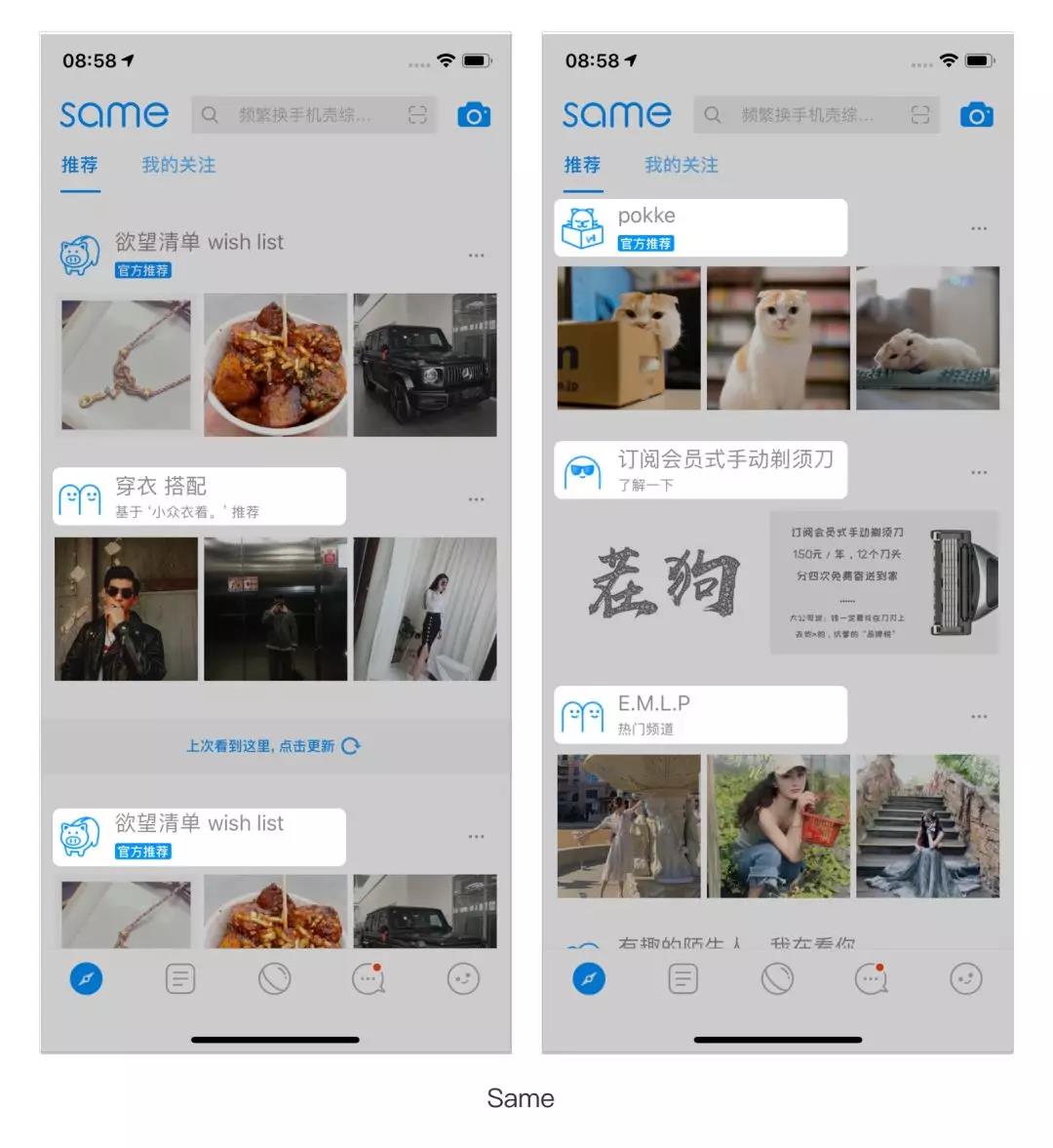 同样都是UGC内容为核心的产品,最右,即刻和same界面就很不一样,same的界面就很有识别度,因为每一个不同的主题都有符合same产品调性的小表情插画,这种在设计趣味性图标的时候可以参考。如下图所示: