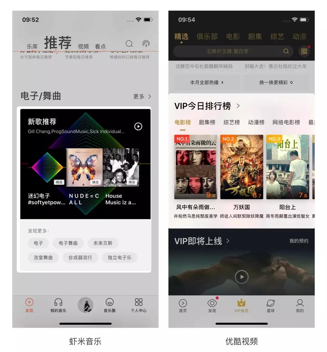 比如上图中,虾米音乐的首页中的一个小模块,展现形式就比较特别,在别的页面这种形式比较少见,同时又能展现电子舞曲的视觉风格;优酷的VIP排行表现形式也比较特殊,大多数同种组建的展现形式都是以封面的图片加上高斯模糊为背景,但优酷就比较特别,很干净的展现形式同时又很有呼吸感。