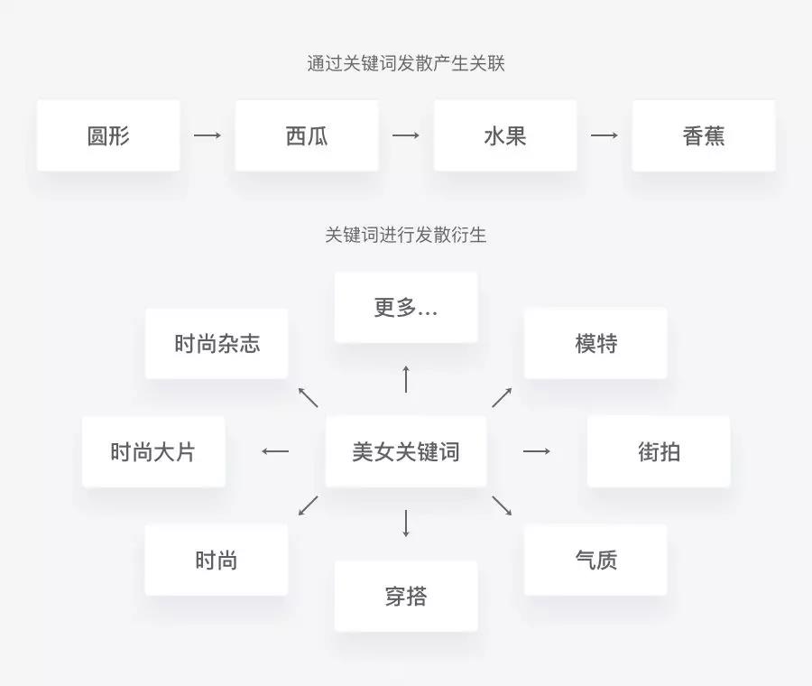 举一个简单的例子来说一下关键词发散的作用,比如圆形和香蕉是没有本质联系的,但是通过关键词发散就会产生关联,圆形→西瓜→水果→香蕉。换到图片资源中来原理相似,比如我们要找一张美女图片,不一定搜索的关键词是“美女”,这个关键词进行发散可以衍生出时尚杂志、街拍、模特、气质、时尚大片、穿搭等等关键词,这样通过发散出来的关键词也许能找到更加符合的图片资源。