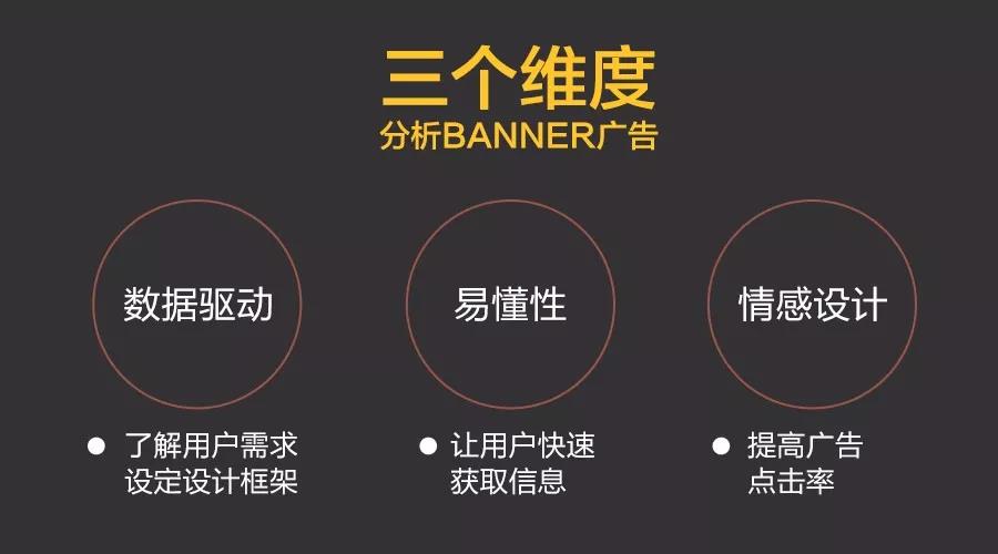 而设计师在设计banner广告图之前,一般会参考之前投放的结果数据,例如设计A类的广告投放量、阅读量、点击率等等数据去分析A图的好坏,再通过大量的数据比对来分析出A图中哪个单一框架所产生的作用更大,从而为后面的设计做参考。(ps:广告banner的点击量不仅仅在于视觉,跟产品、投放渠道等也有影响,在结果数据分析时应当注意)