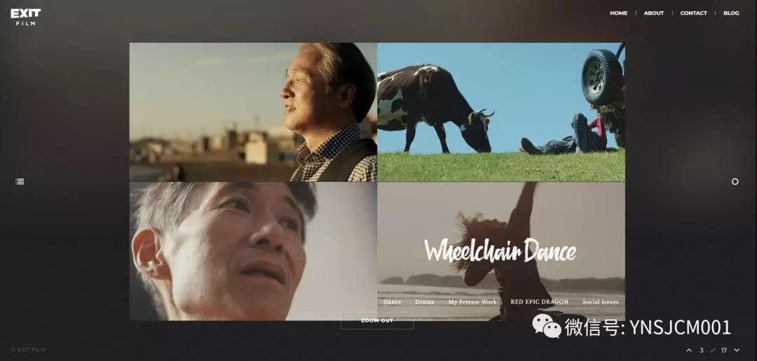 Exit Film这个网站以非入侵式的方式在一个屏幕上展示了四个视频,优雅的剧中布局配合深色底,精致的细节和排版使得网站视觉极具冲击力,同时又不会给用户造成视觉负担。