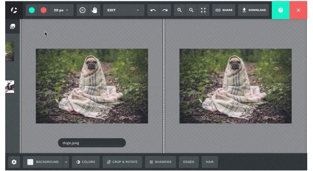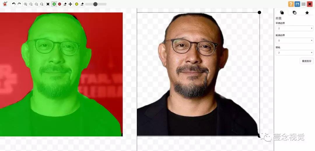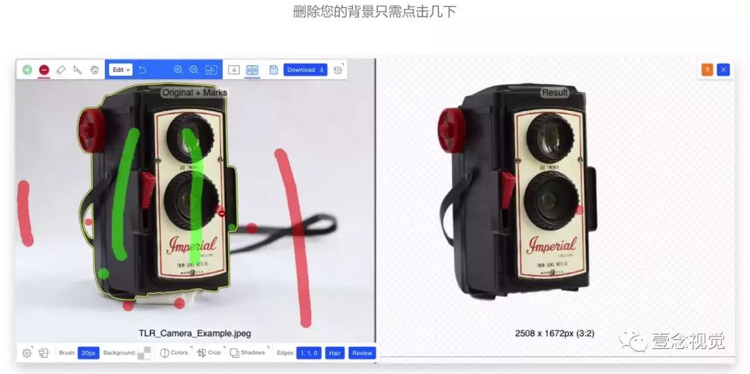 进入Clipping Magic网站后,先上传需要处理的照片。等待几秒后就进入处理页面后,左边为原图,右边为效果图。右上角选择“+”(绿色)图标,点击图片想保留的元素,选择“-”(红色)图标,点击图片不需要的元素即可剔除。简单的说就是,哪里需要和哪里不需要就点哪里,就可以获取透明背景图片。当然,如果遇到边缘处理不理想的话,还可以用微调工具处理,如橡皮擦、放大缩小功能等进行处理。抠图是一个非常有技术含量的东西,对于大部分人来说,这都是一个棘手的问题,但如果你使用了Clipping Magic这个在线工具,那么抠图就变得小菜一碟了。