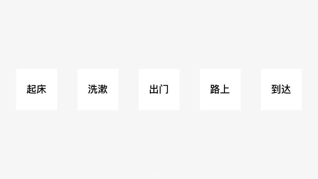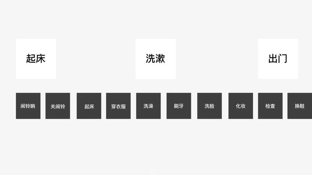 场景的梳理,先以颗粒度大的骨干场景出发,比如,举一个生活中常见的例子,主场景是:起点是起床-终点是到公司。我们可以回想一下在整个过程中我们经历了哪些大的阶段?对,经历了:起床—洗漱—出门—路上—到达。