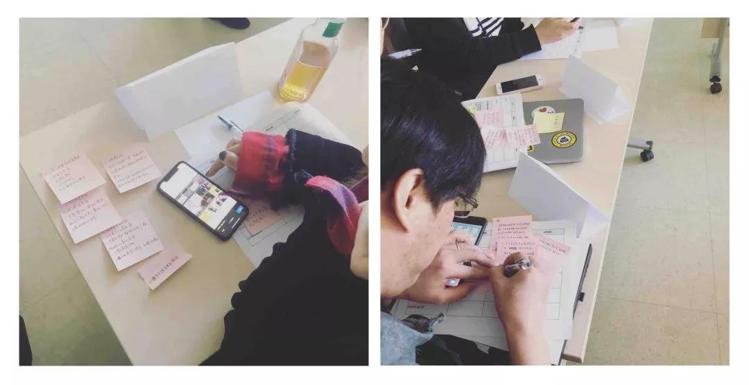 在这个环节,我们需要把之前记录员梳理出来的用户在不同阶段中反馈(触点、行为、痛点、爽点),写在不同颜色的便利贴上,把“我+动词”放到“行动Doing”一栏,把“我觉得”放在“感受feeling”一栏,这样,能让地图更加清晰。