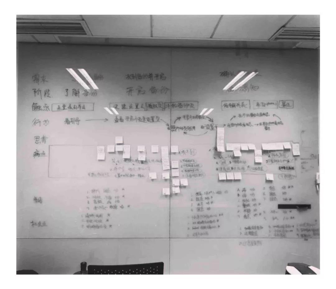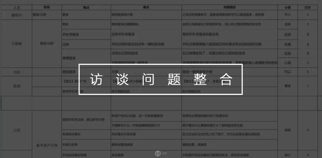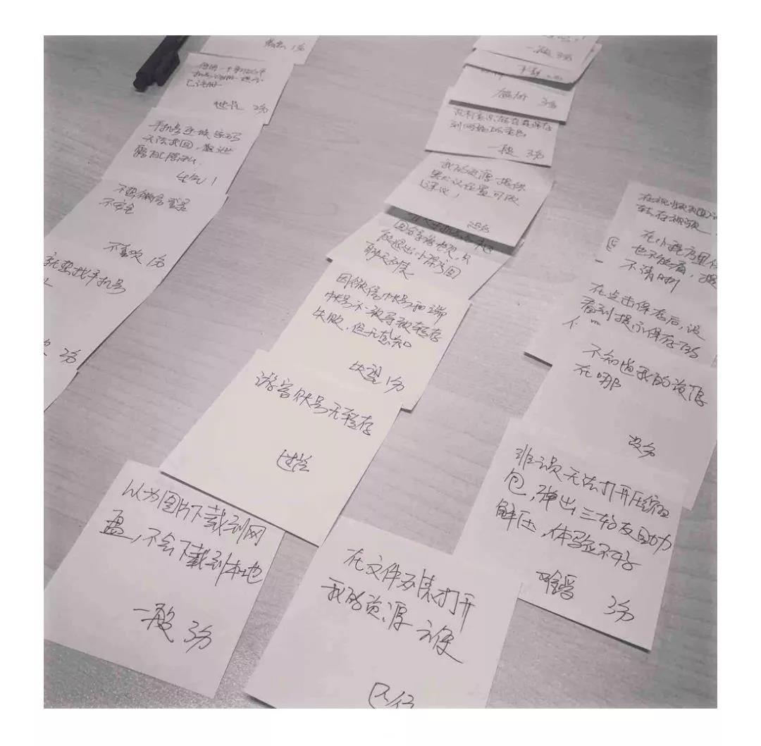 以上是“用户访谈”环节需要注意的事儿:a.提前收集并了解用户信息,有针对性和差异化的进行访谈;b.身为访谈人员,不能完全相信用户口中说的,更应该观察他的行为举止背后的问题;c.身为记录人员,访谈结束后,对所有被访谈的用户记录进行格式化的整合和去重,为绘制体验地图作准备。