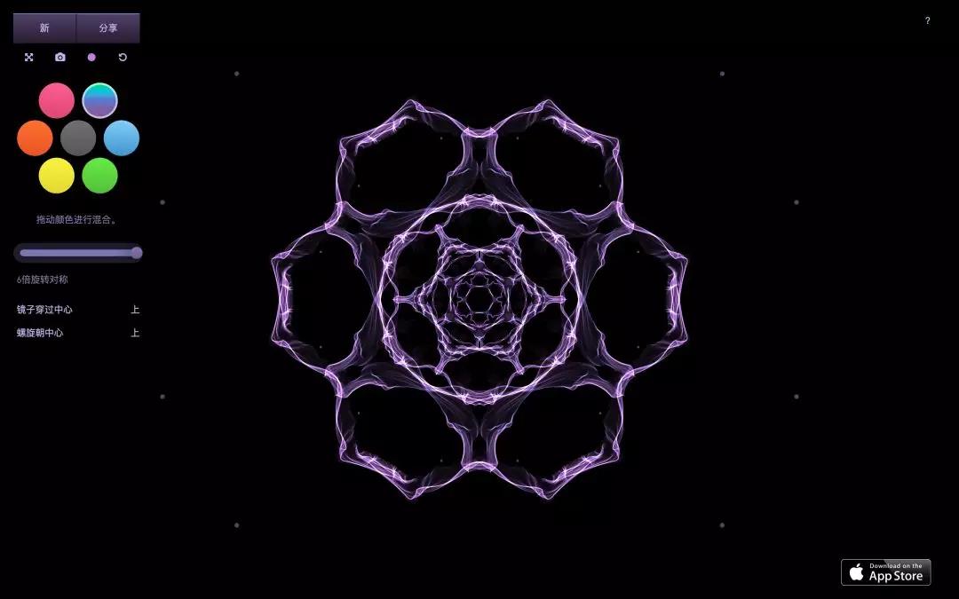 一款非常容易上手的炫光生成器,可以修改颜色,对称点的数量等等,你随便勾一笔,就可以得到下面的效果。