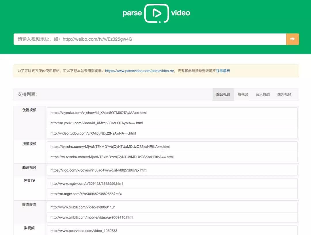 Parsevideo 是一个功能非常强大的视频下载网站,支持国内外多个主流视频网站的视频下载;包括:优酷,腾讯视频,芒果TV,哔哩哔哩,梨视频,酷燃视频,头条视频,微博视频,还有各种短视频平台的视频和国外视频平台的视频,支持的视频平台非常多。