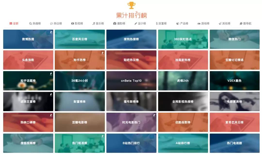 果汁排行榜是一个聚合各种排行榜的一个实用网站,你可以利用这个网站轻松查询到各个方面的排行榜。