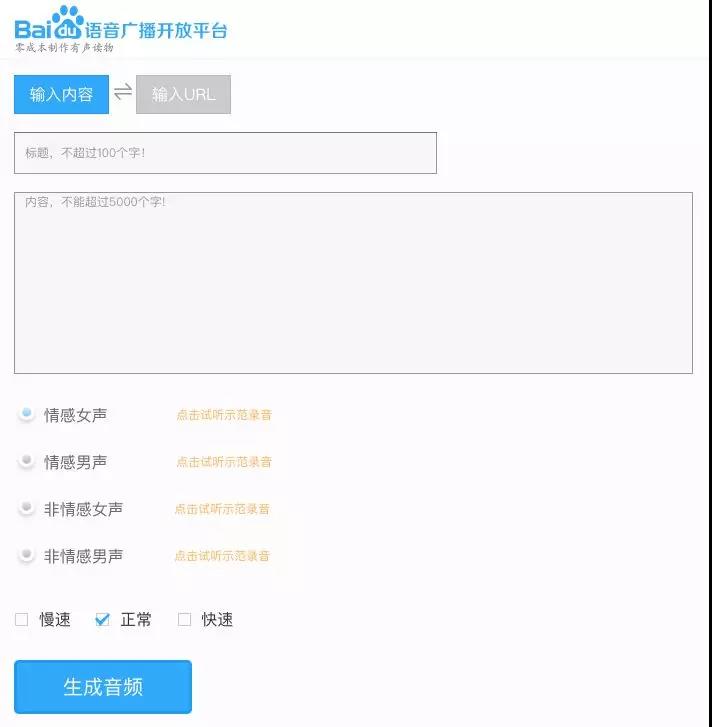 百度语音广播开放平台是百度出品的一个实用的在线文字转语音网站。它的使用方法非常简单,你可以直接输入标题和内容,也可以选择输入网页链接,网站会自动解析出网页标题和内容,然后选择合适的人声:情感女声、情感男声、非情感女声、非情感男声,选择语音的速度:慢速、正常、快速,最后直接点击生成音频按钮就可以生成转换好的音频。