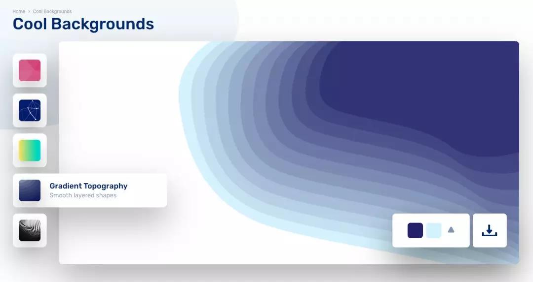 很酷的背景是一个高质量背景图片生成网站,我们可以看到网站提供 5 种不同的背景模板,每一个背景模板的质量都很高,你可以自定义背景模板的颜色,然后背景图片会实时生成展现,然后你就可以把生成好的背景图片直接下载下来。